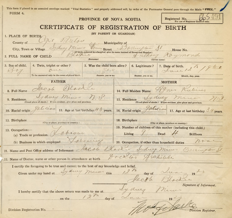 21. Name and Post Office address of Informant Jacob Blackie Sydney Mines, Barrington St.