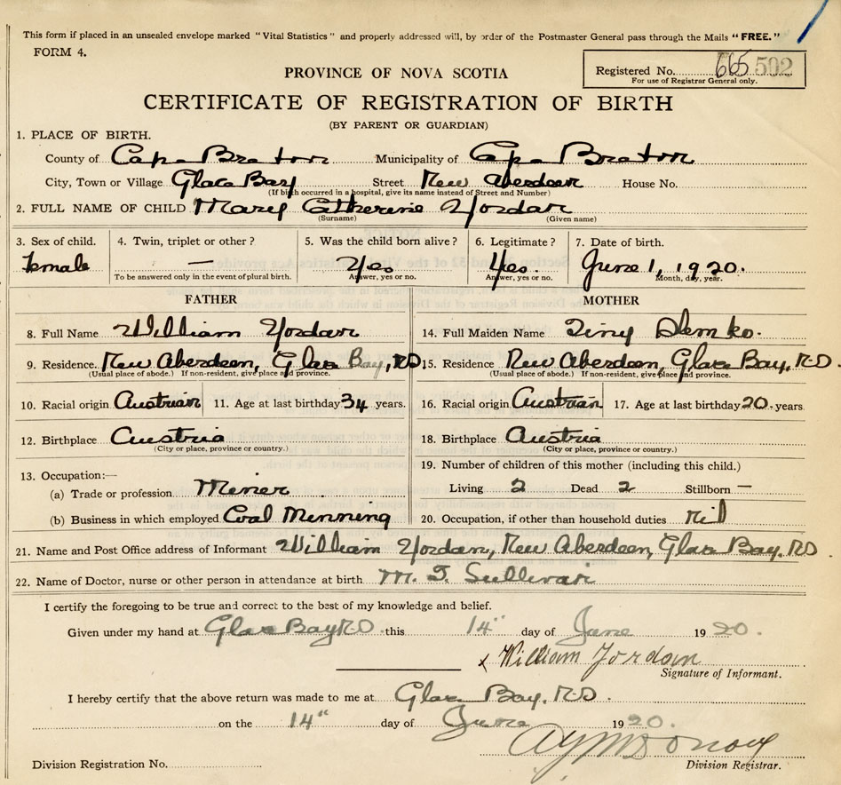 21. Name and Post Office address of Informant William Yordan New Aberdeen, Glace Bay