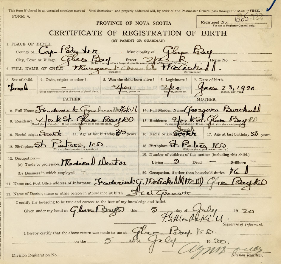 21. Name and Post Office address of Informant Frederick G. McAskill (M.D.) Glace Bay