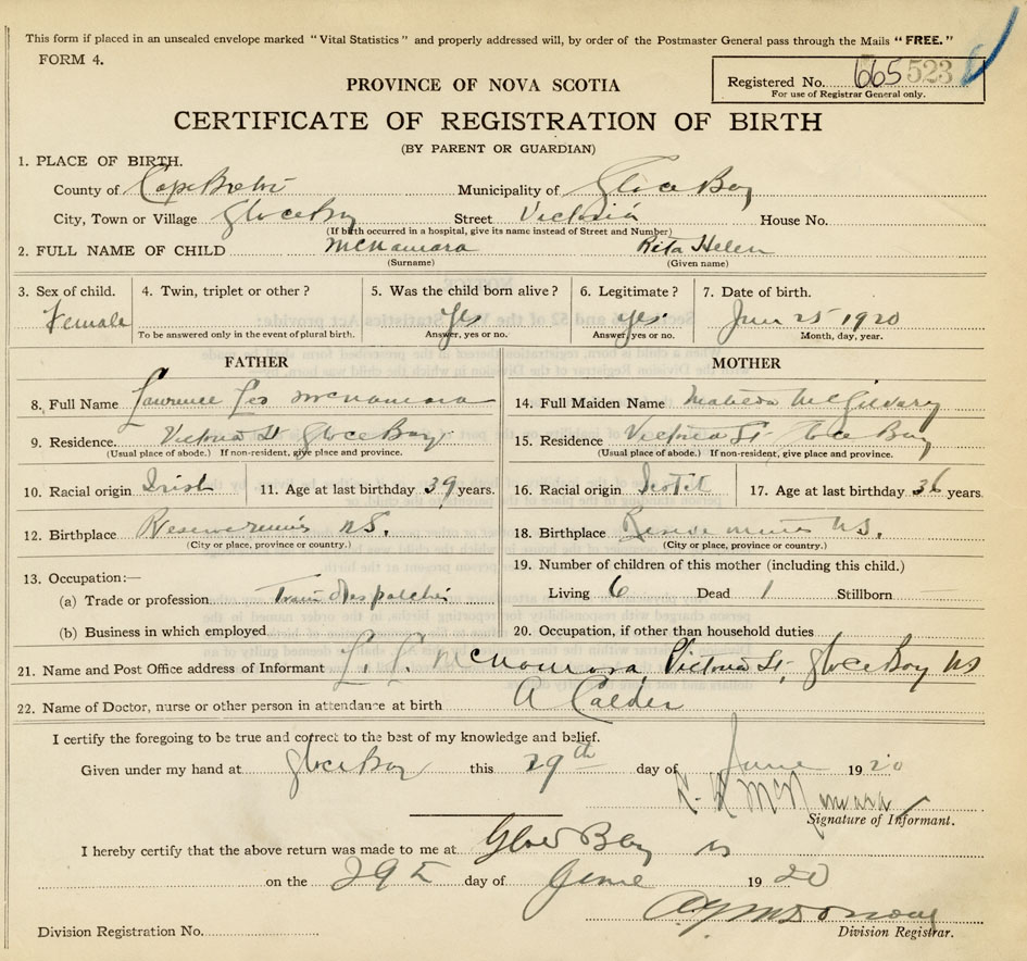 21. Name and Post Office address of Informant L.L. McNamara Victoria St., Glace Bay