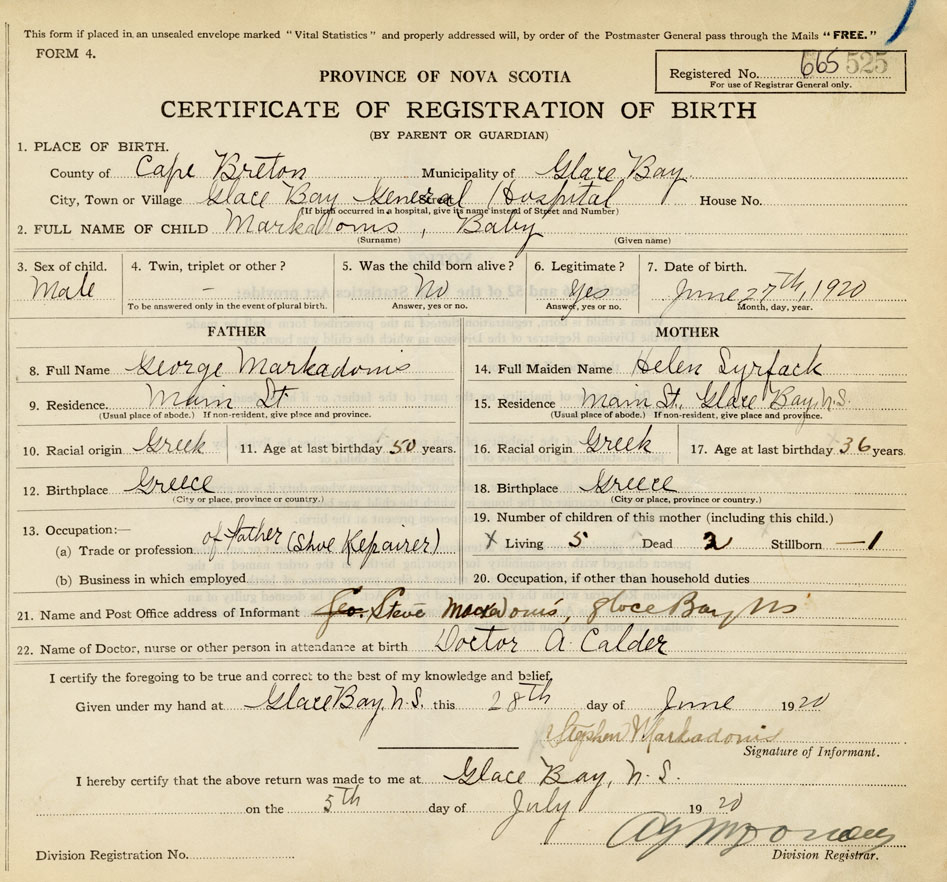 21. Name and Post Office address of Informant Steve Markadonis Glace Bay