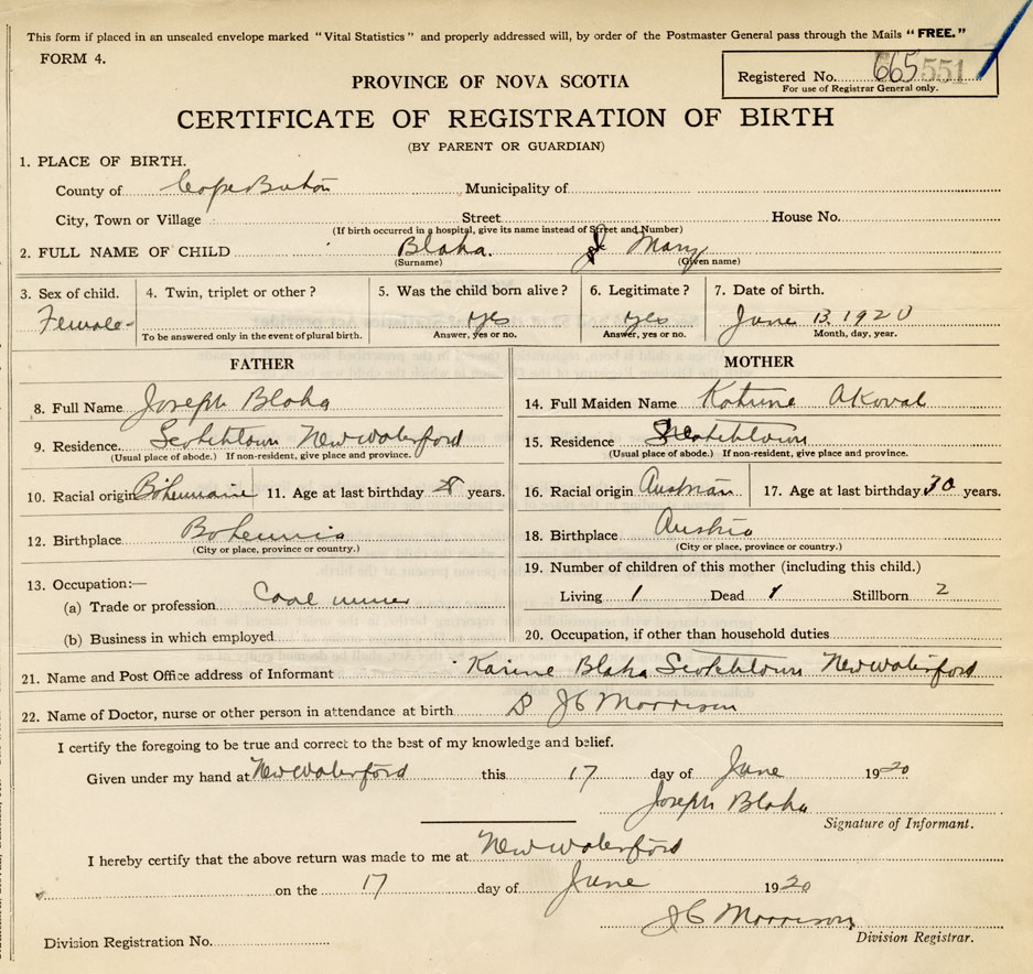 21. Name and Post Office address of Informant Katrine Blaha Scottishtown New Waterford