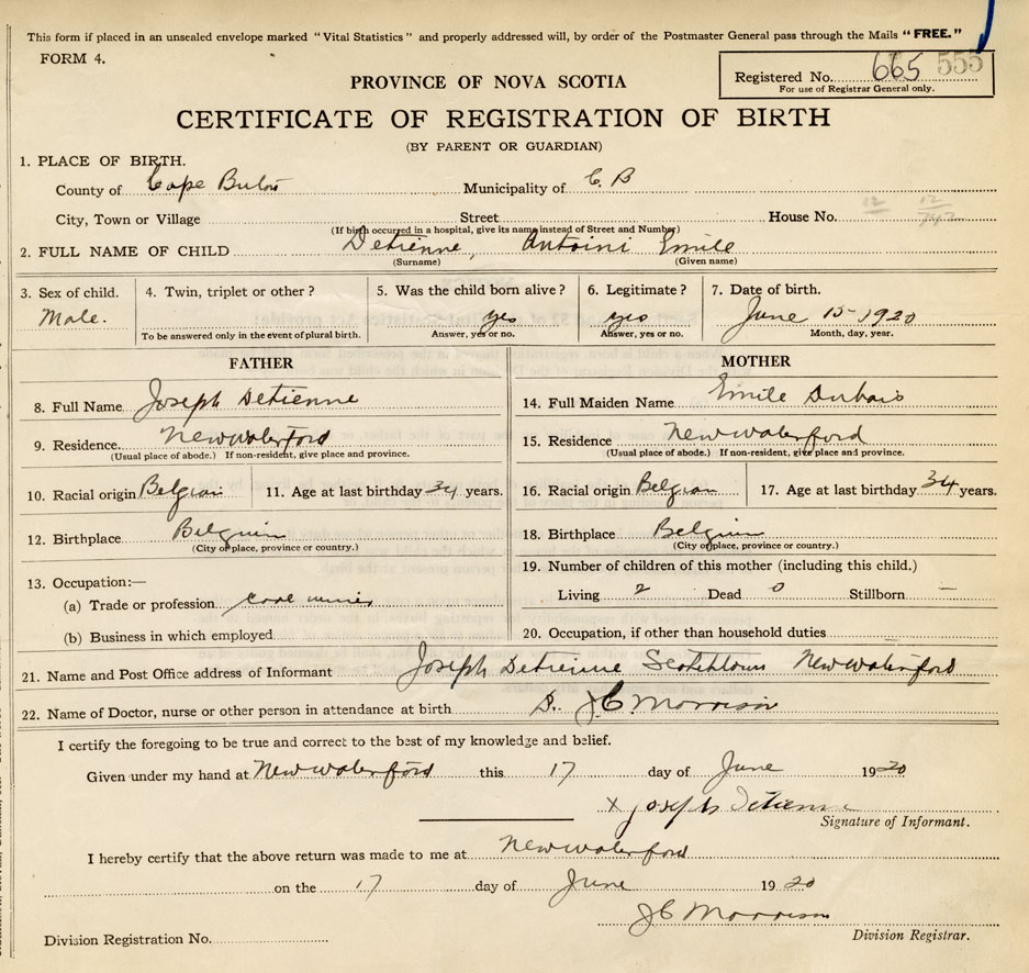 21. Name and Post Office address of Informant Joseph Detienne Scottishtown, New Waterford