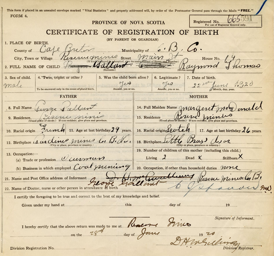 21. Name and Post Office address of Informant George Gallant Reserve Mines, C.B