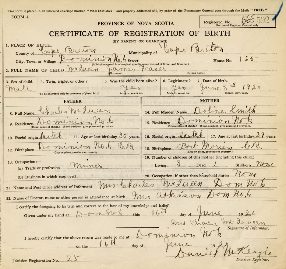 21. Name and Post Office address of Informant Mrs. Charles McQueen Dominion No. 6