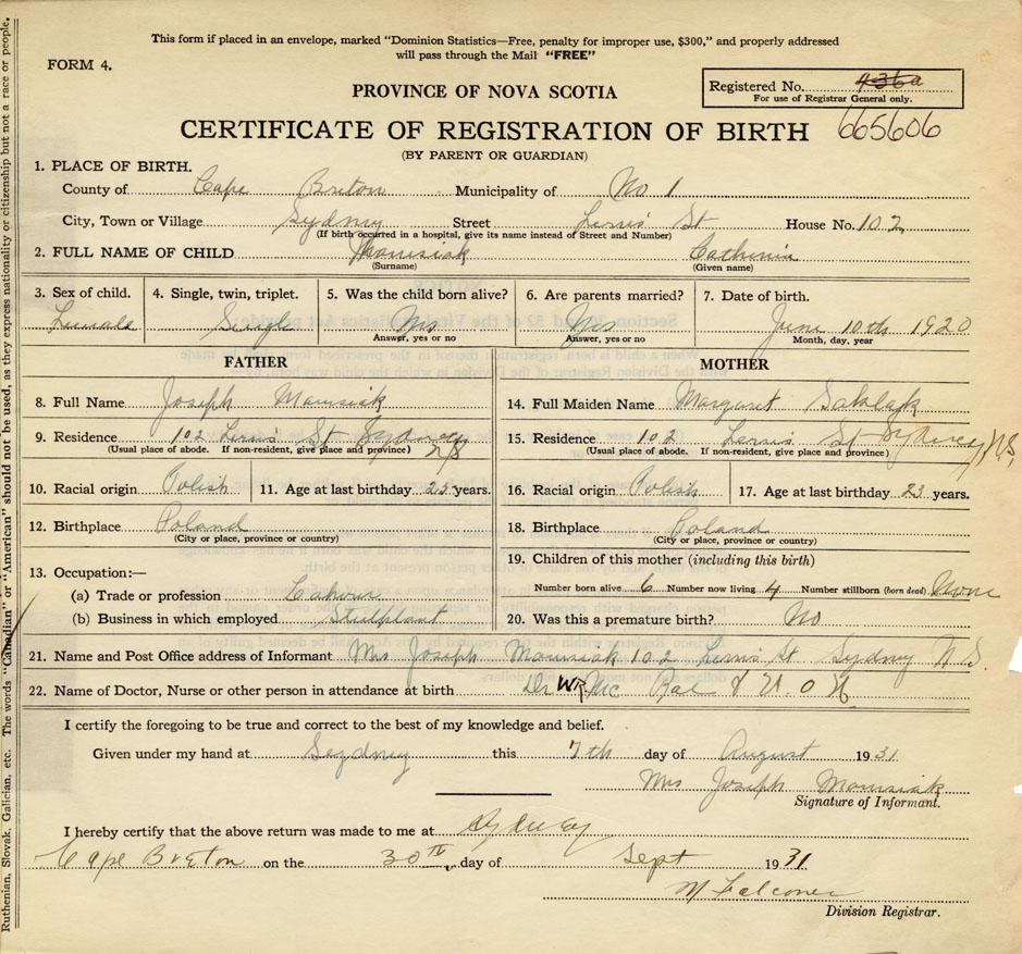 21. Name and Post Office address of Informant Mrs. Joseph Manisiak 102 Lerns St., Sydney