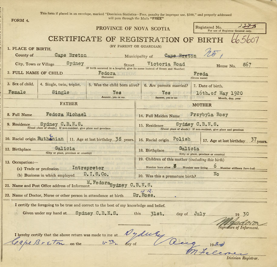 21. Name and Post Office address of Informant M. Fedora SydneyN.S.