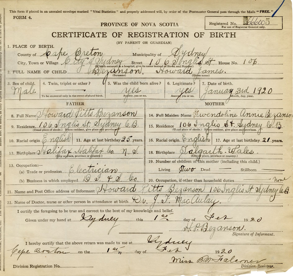 21. Name and Post Office address of Informant Howard Pitts Bezanson 106 Inglis St., Sydney