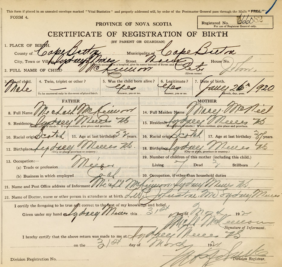 21. Name and Post Office address of Informant Michael McKinnon Sydney Mines
