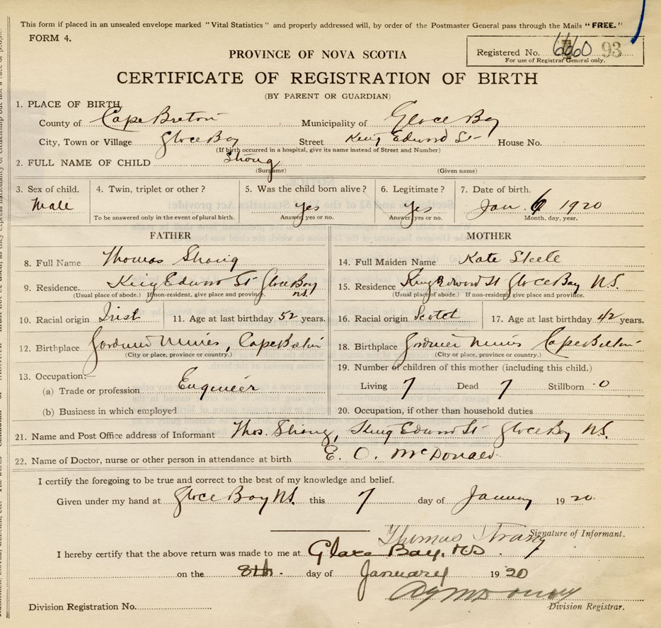 21. Name and Post Office address of Informant Mrs. Strang King Edward St., Glace Bay