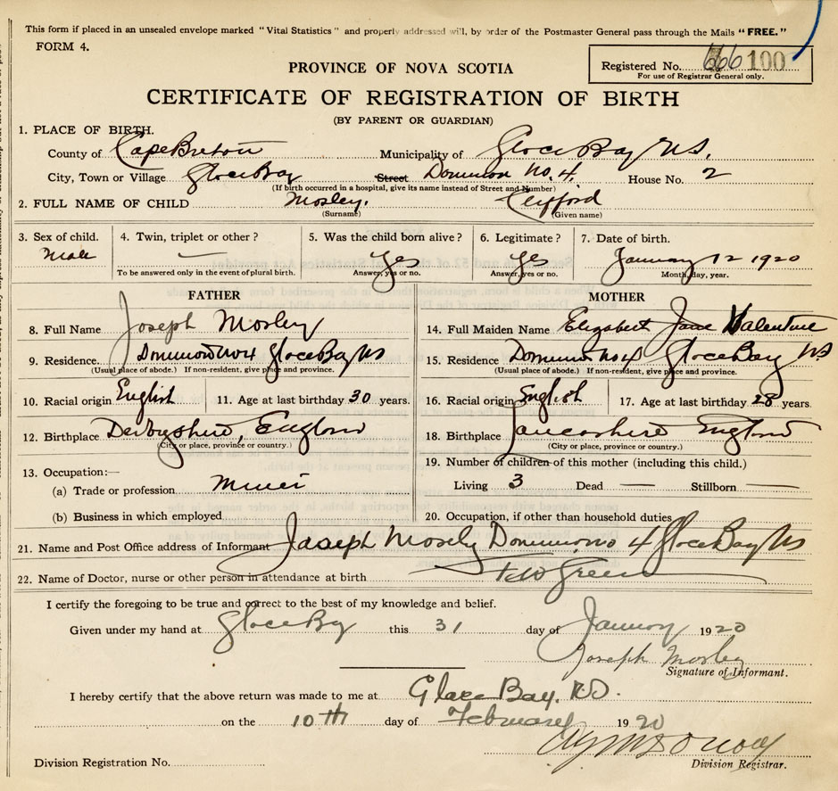 21. Name and Post Office address of Informant Joseph Mosley Dominion No 4, Glace Bay
