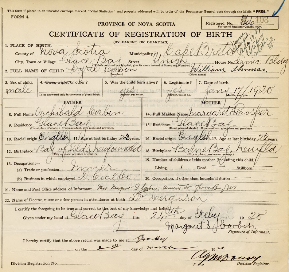 21. Name and Post Office address of Informant Mrs. Margaret I. Corbin Union St., Glace Bay