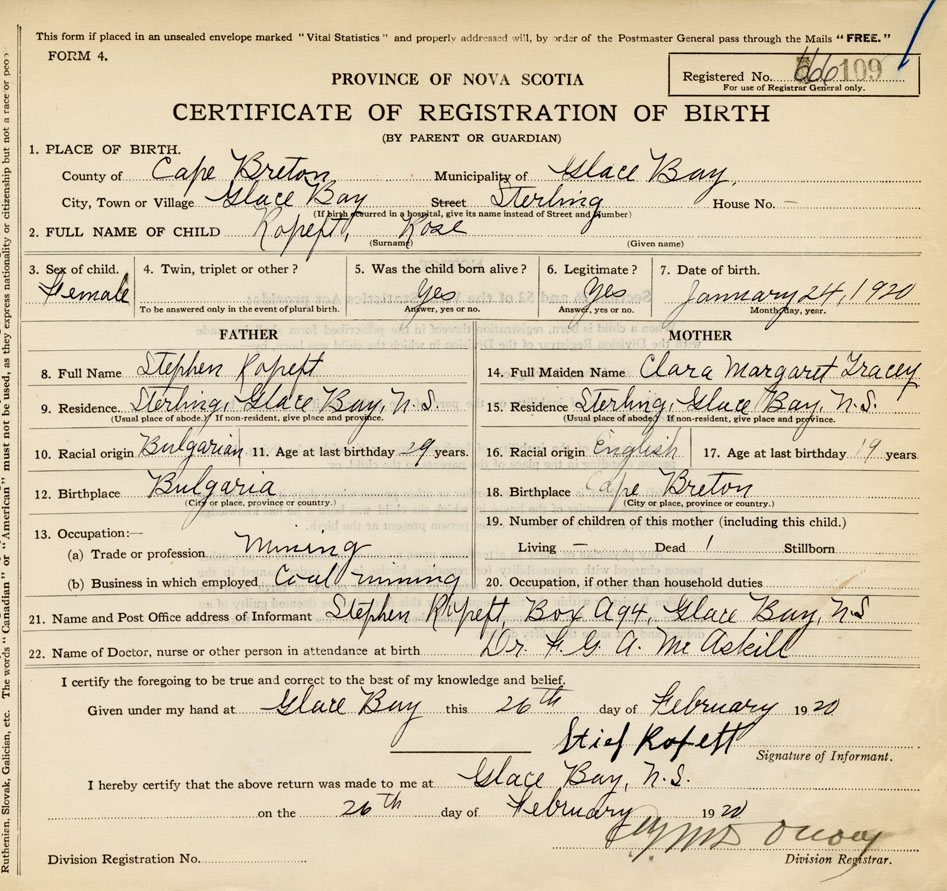 21. Name and Post Office address of Informant Stephen Ropeft Box A94, Glace Bay, N. S.