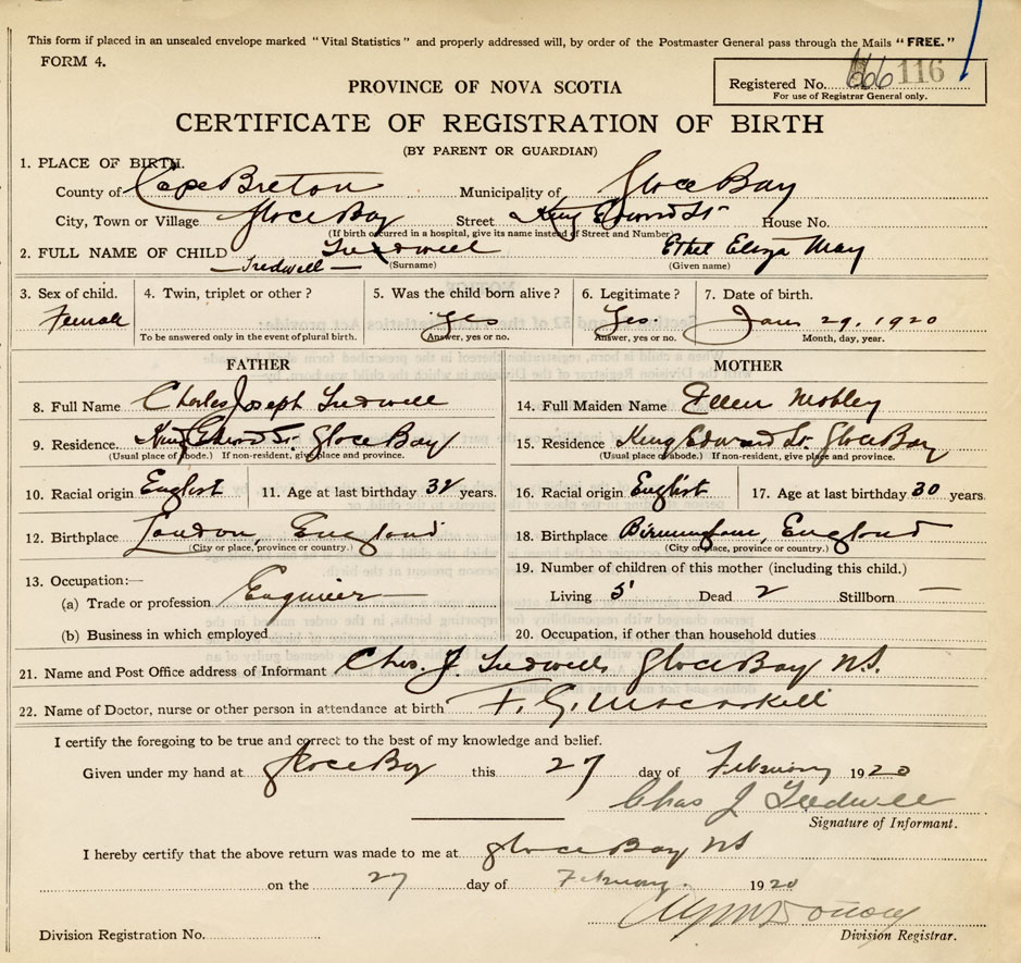 21. Name and Post Office address of Informant Chas. J. Tredwell Glace Bay