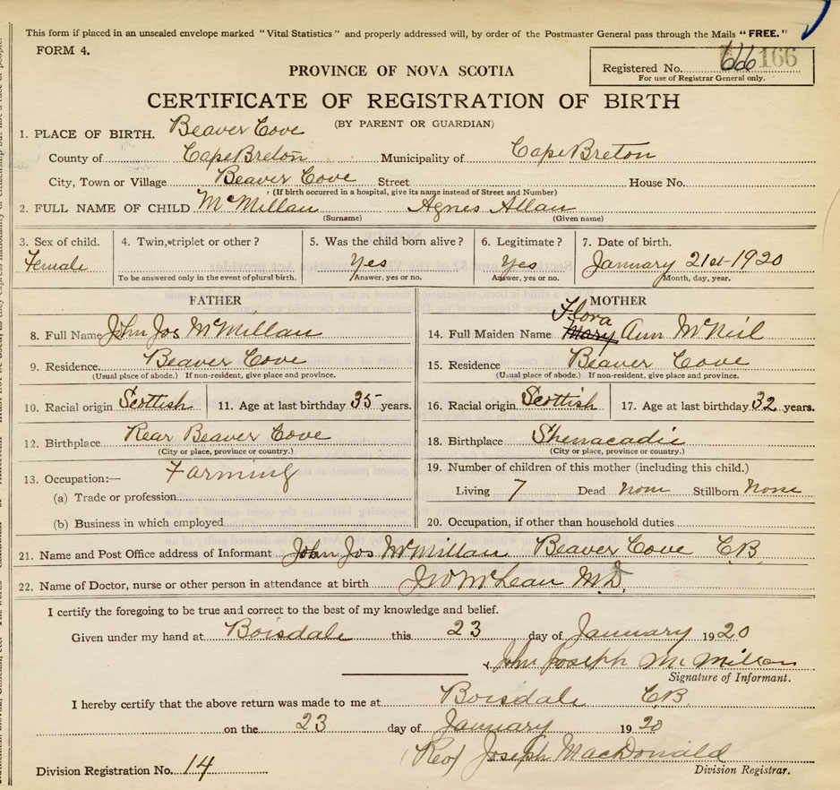 21. Name and Post Office address of Informant John Jos. McMillan Beaver Cove