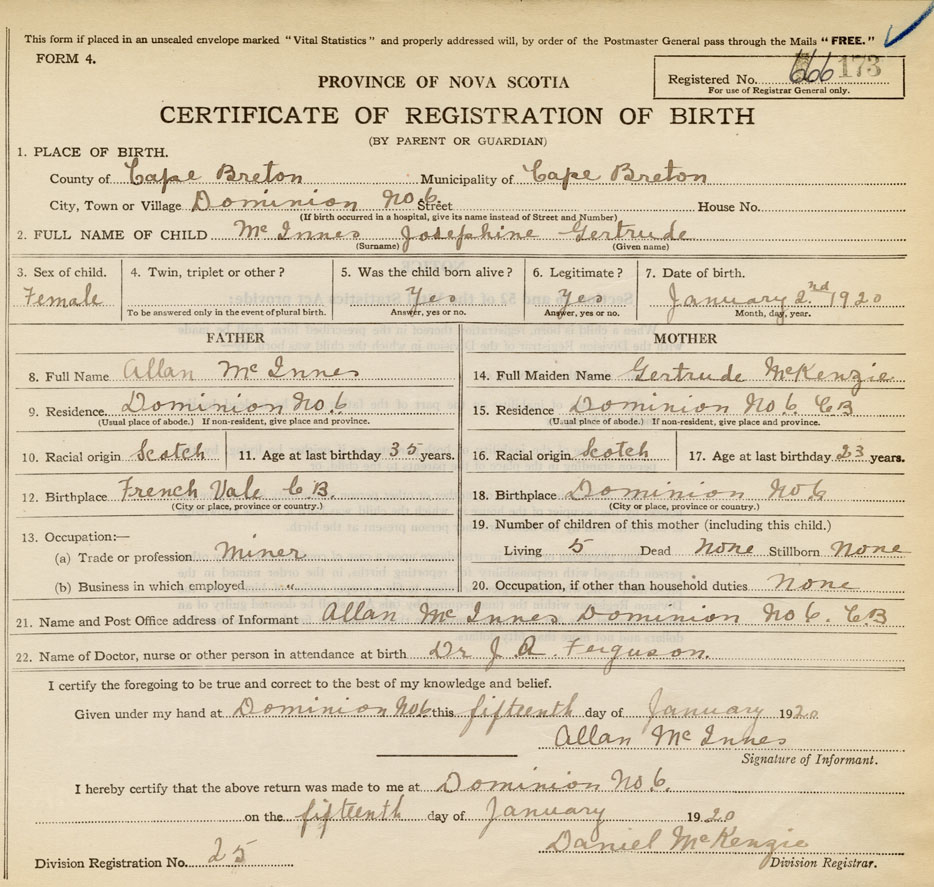 21. Name and Post Office address of Informant Allan McInnes Dominion No. 6, Cape Breton