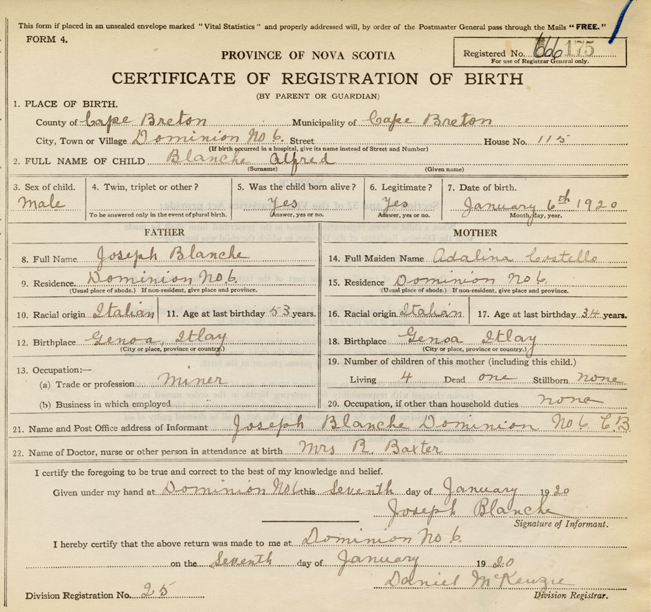 21. Name and Post Office address of Informant Joseph Blanche Dominion No. 6