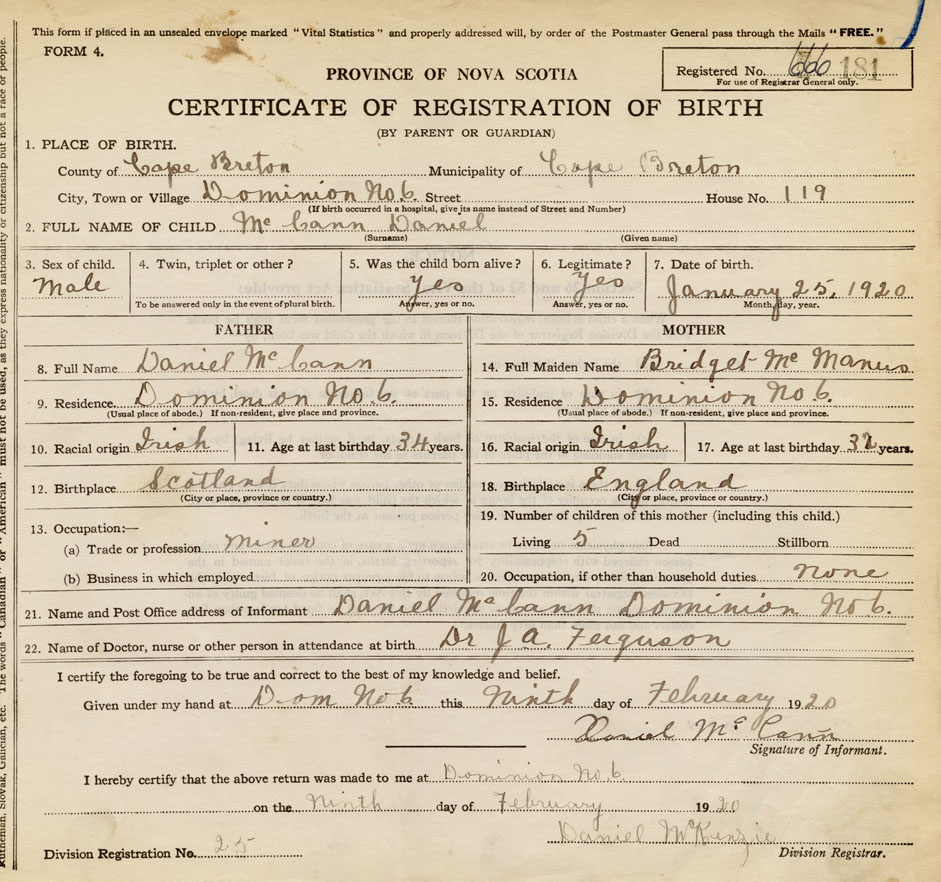 21. Name and Post Office address of Informant Daniel McCann Dominion No. 6