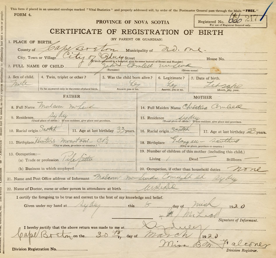 21. Name and Post Office address of Informant Malcom McLeod Cambell Street, Sydney, Cape Breton Co.