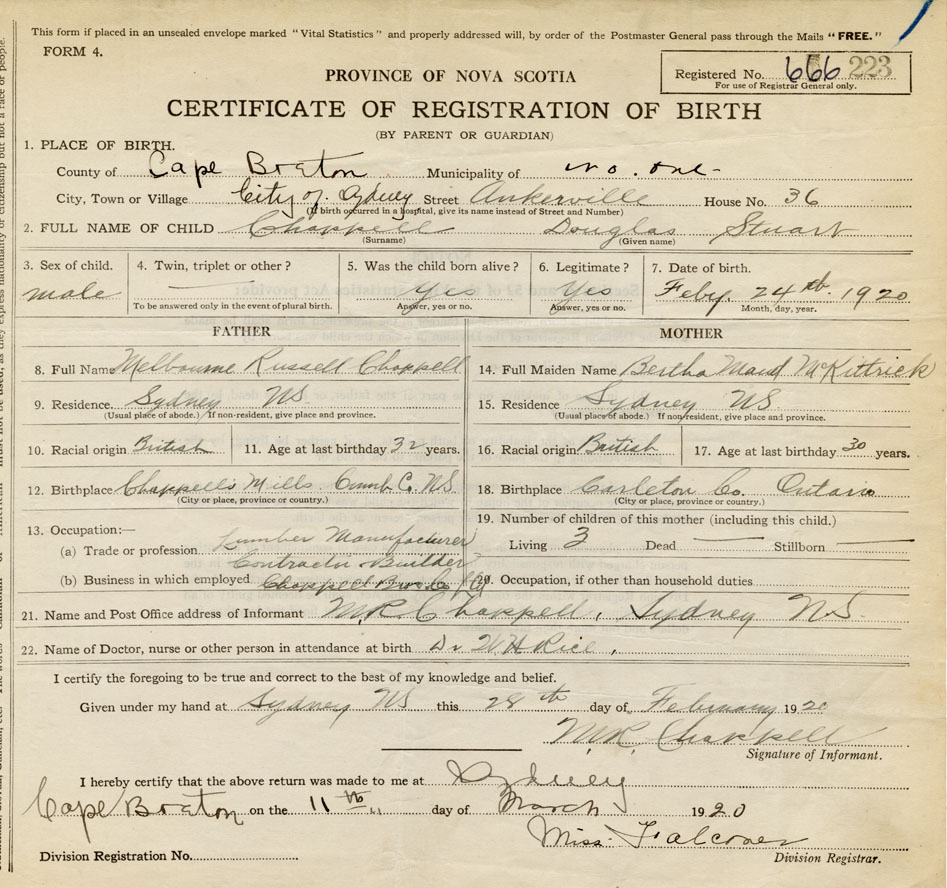 21. Name and Post Office address of Informant M. R. Chappell Sydney, Cape Breton Co.