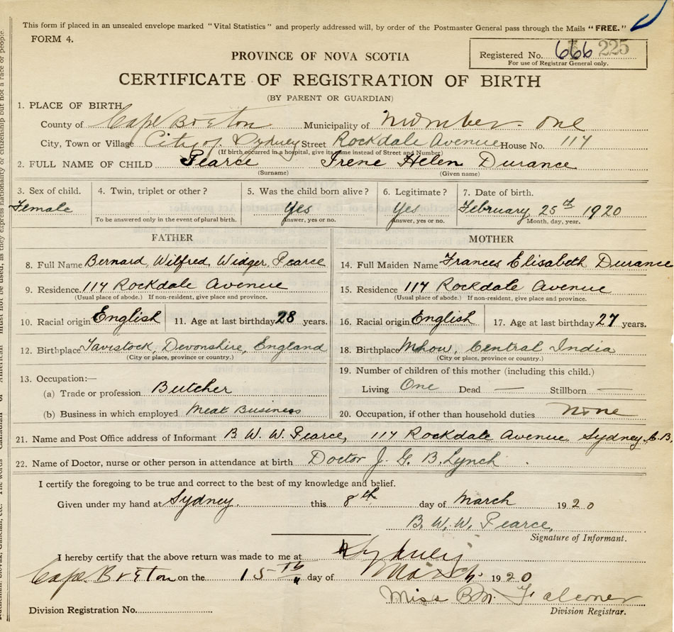 21. Name and Post Office address of Informant B. W. W. Pearce 117 Rockdale Avenue, Sydney, Cape Breton Co.