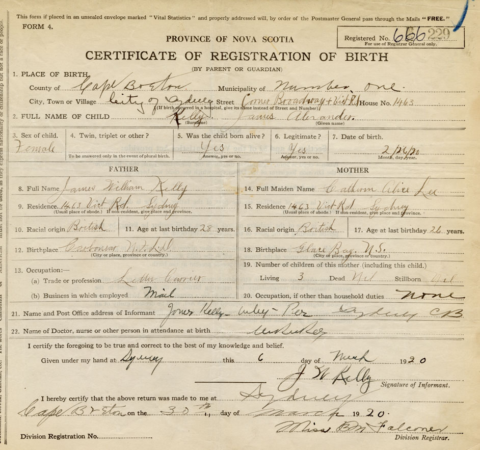21. Name and Post Office address of Informant James Kelly Whitney Pier, Sydney, Cape Breton Co.