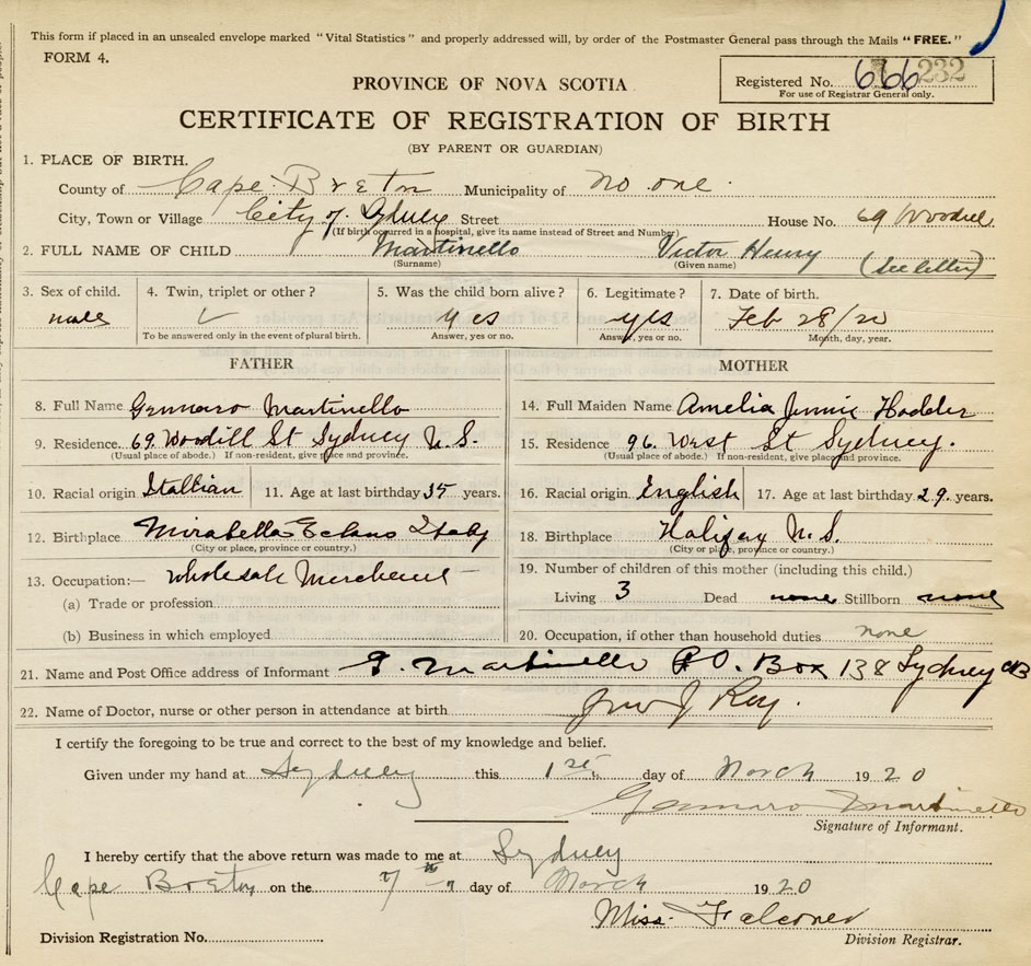 21. Name and Post Office address of Informant G. Martinello PO box 138, Sydney, Cape Breton Co.