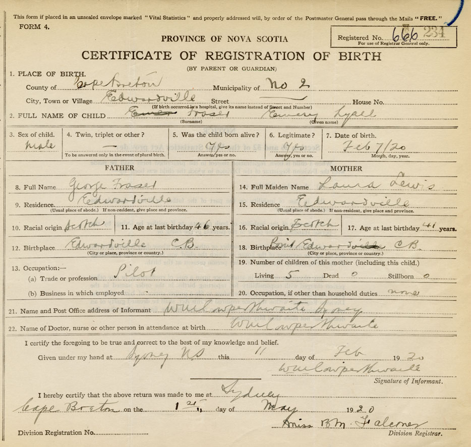 18. Birthplace Edwardville, Cape Breton Co.