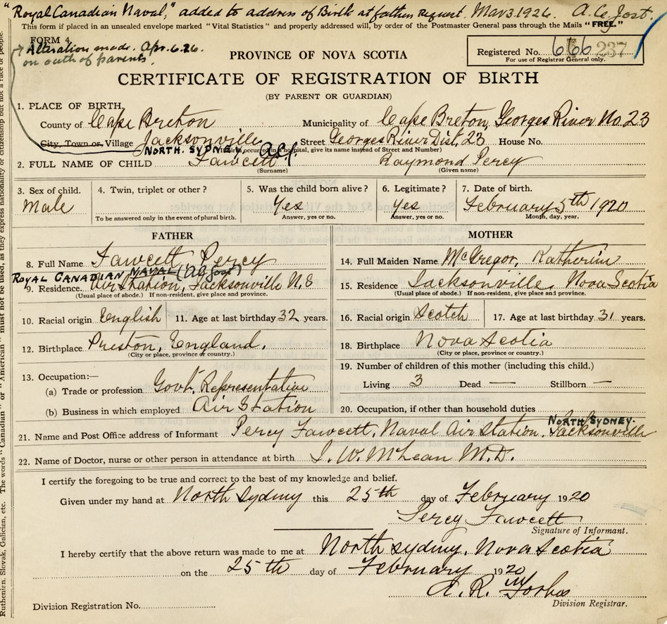 21. Name and Post Office address of Informant Percy Fawcett naval Air Station, North Sydney, Cape Breton Co.