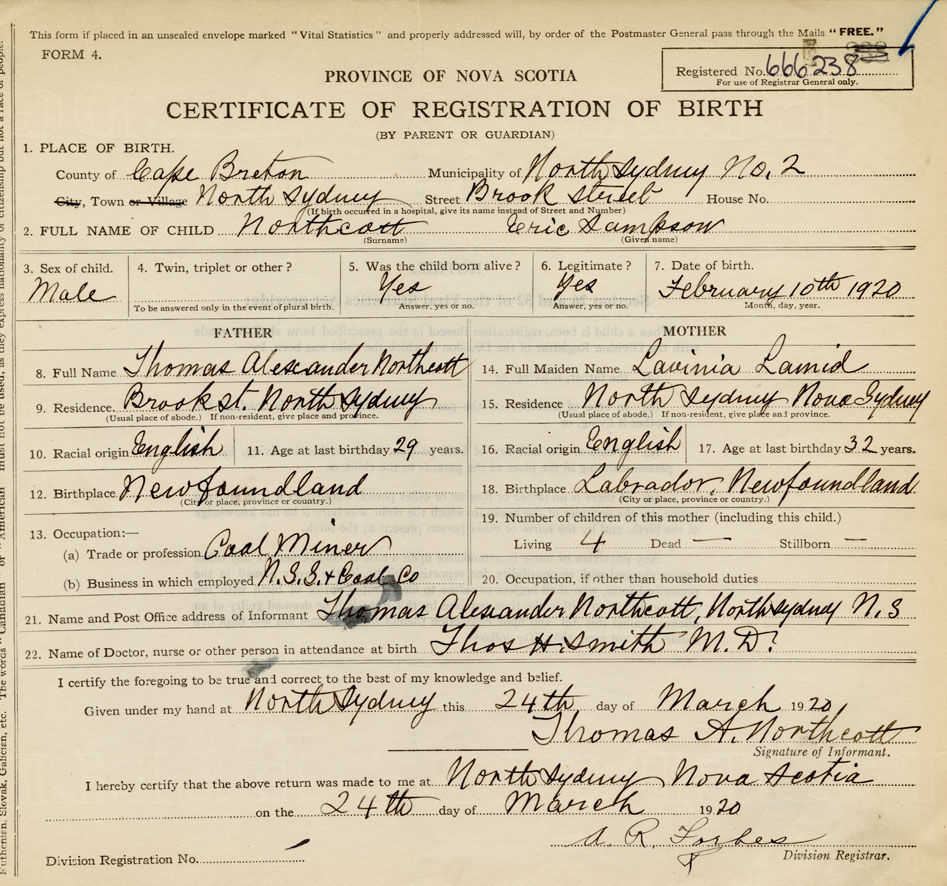 21. Name and Post Office address of Informant Thomas Alexander Northcott North Sydney, Cape Breton Co.