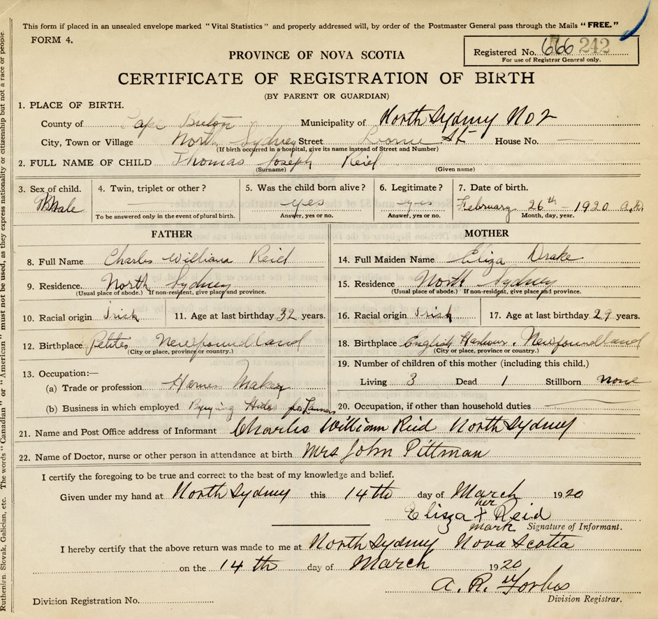 21. Name and Post Office address of Informant Charles William Reid North Sydney, Cape Breton Co.