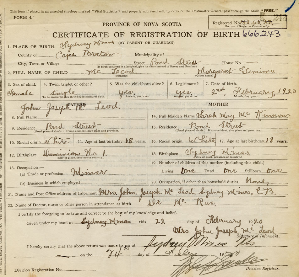 21. Name and Post Office address of Informant Mrs. John Joseph McLeod Sydney Mines, Cape Breton Co.