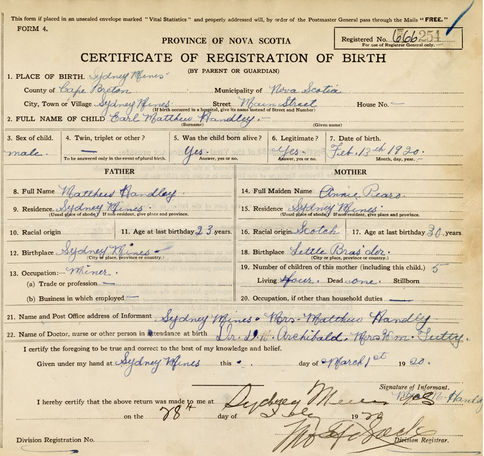 21. Name and Post Office address of Informant Mrs. Matthew Handley Sydney Mines