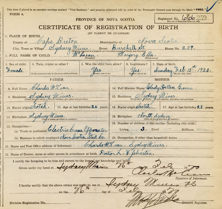 18. Birthplace Sydney Mines, Cape Breton Co.