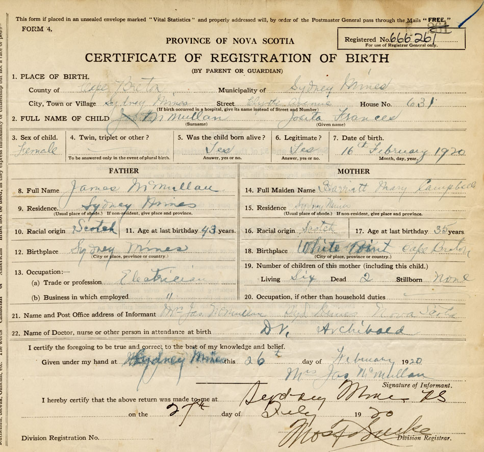 21. Name and Post Office address of Informant Mrs. James McMullan Sydney Mines, Cape Breton Co.