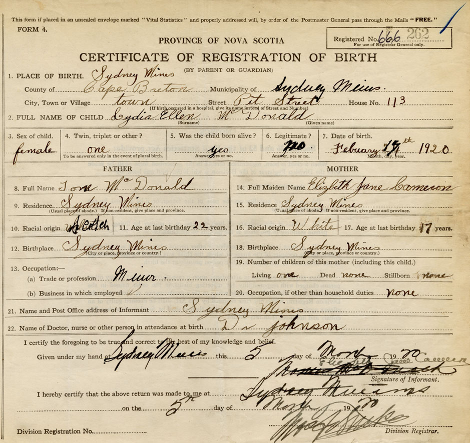 18. Birthplace Sydney Mines, Cape Breton Co.