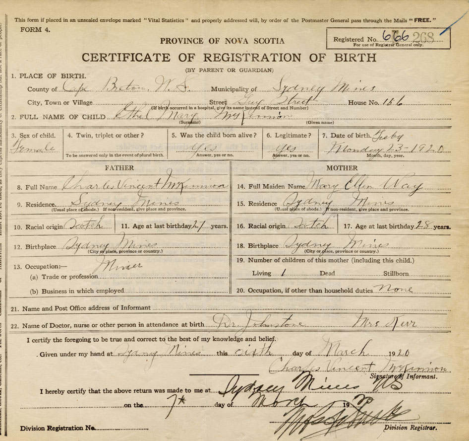 18. Birthplace Sydney Mines, Cape Breton Co.