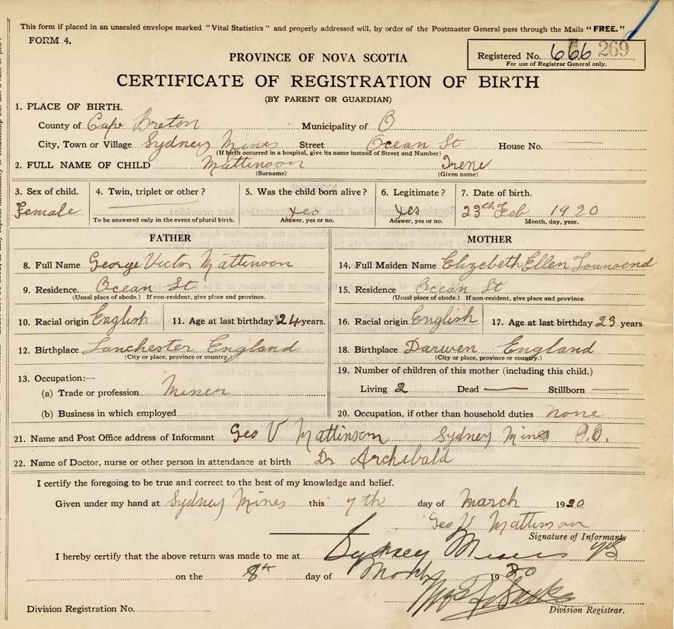21. Name and Post Office address of Informant Geo. V. Mattinson Sydney Mines, Cape Breton Co.