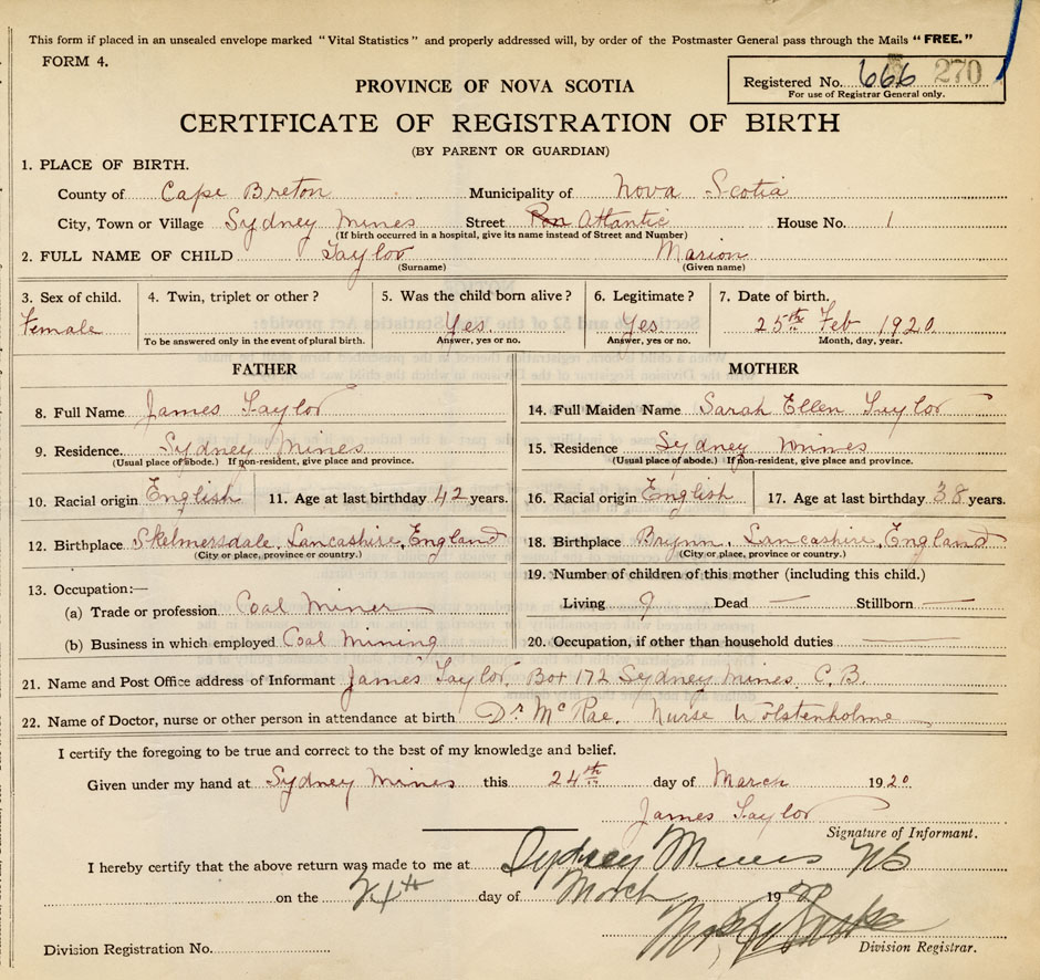 21. Name and Post Office address of Informant James Taylor Box 172, Sydney Mines, Cape Breton Co.