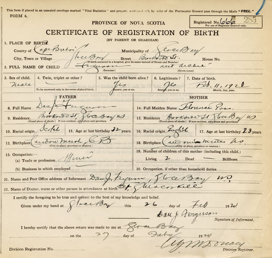21. Name and Post Office address of Informant Dan J. Ferguson Glace Bay, Cape Breton Co.