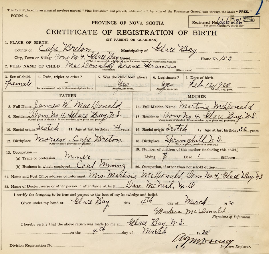 21. Name and Post Office address of Informant Mrs. Martina McDonald Dominion No. 4, Glace Bay, Cape Breton Co.
