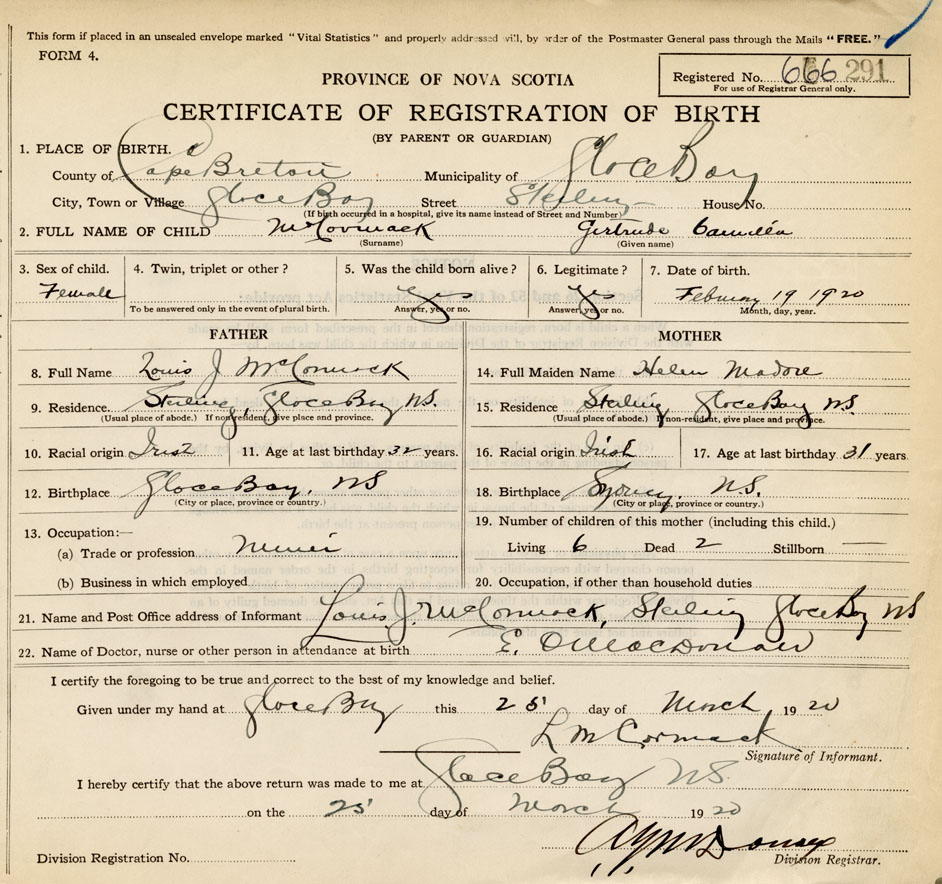 21. Name and Post Office address of Informant Louis J. McCormick Sterling, Glace Bay, Cape Breton Co.