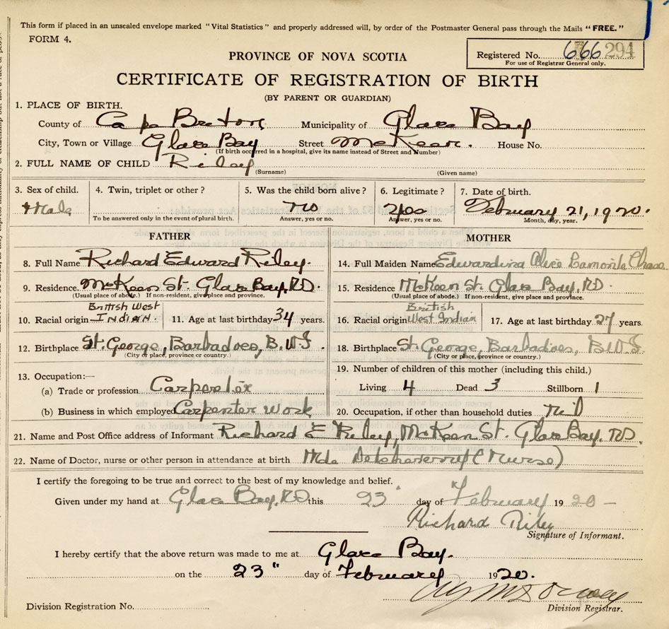 21. Name and Post Office address of Informant Richard E. Riley McKeen Street, Glace Bay, Cape Breton Co.