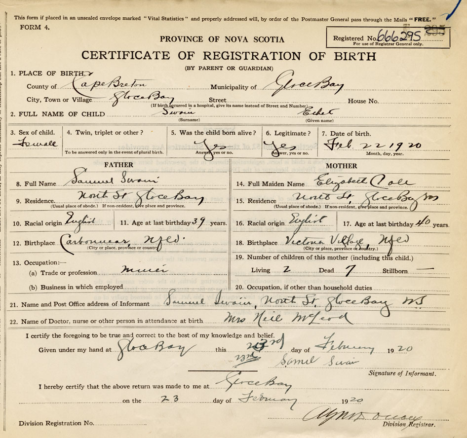 21. Name and Post Office address of Informant Samuel Swain North Street, Glace Bay, Cape Breton Co.
