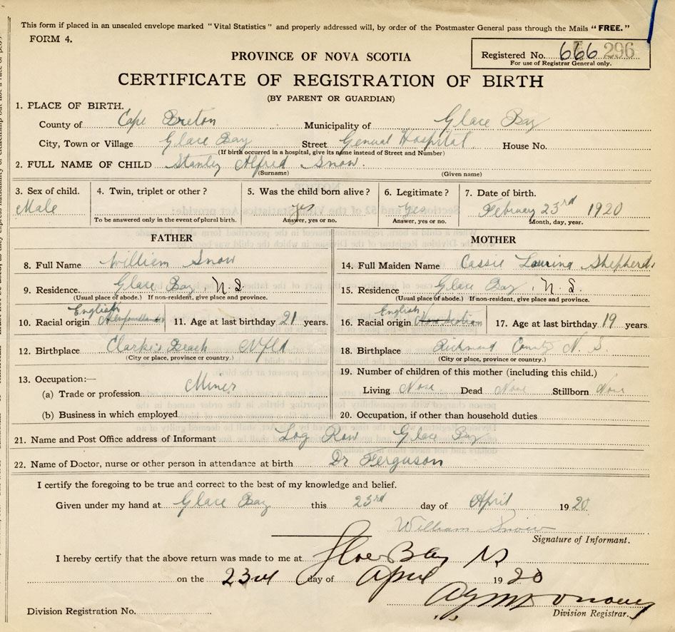 21. Name and Post Office address of Informant Log Row, Glace Bay, Cape Breton Co.