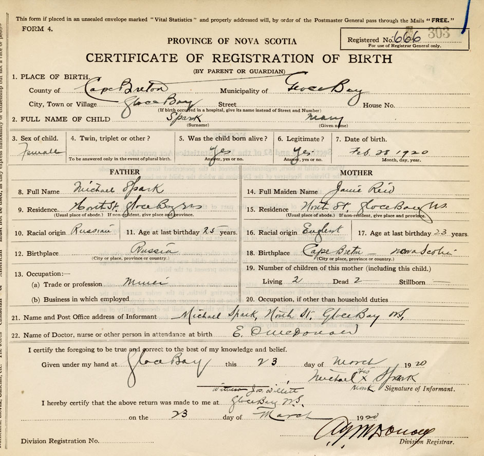 21. Name and Post Office address of Informant Michael Spark North Street, Glace Bay, Cape Breton Co.