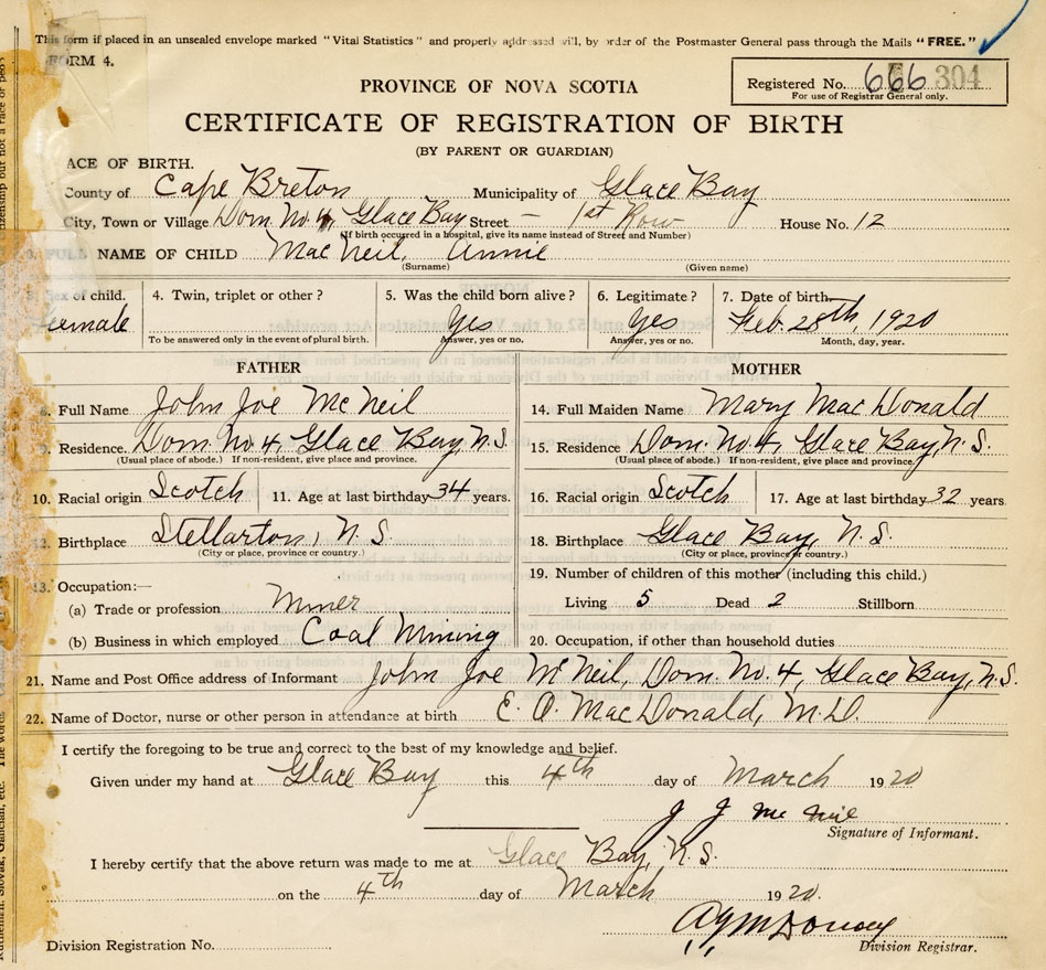 21. Name and Post Office address of Informant John Joe McNeil Dominion No. 4, Glace Bay, Cape Breton Co.