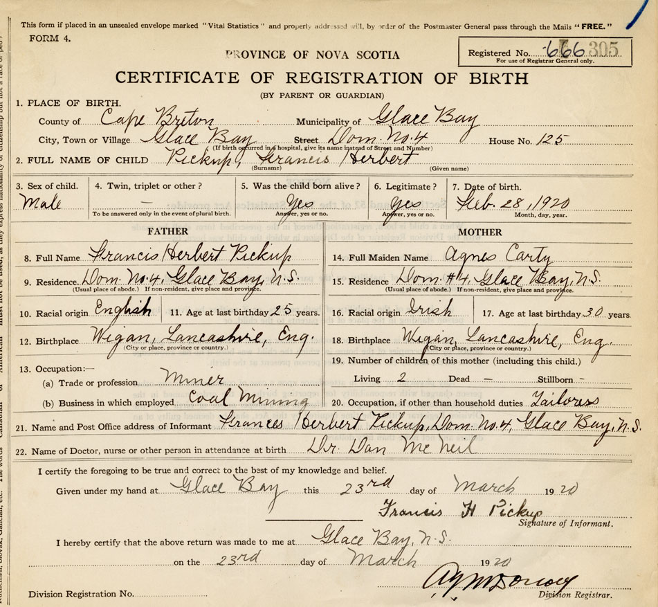 21. Name and Post Office address of Informant Francis Herbert Pickup Dom. #4, Glace Bay