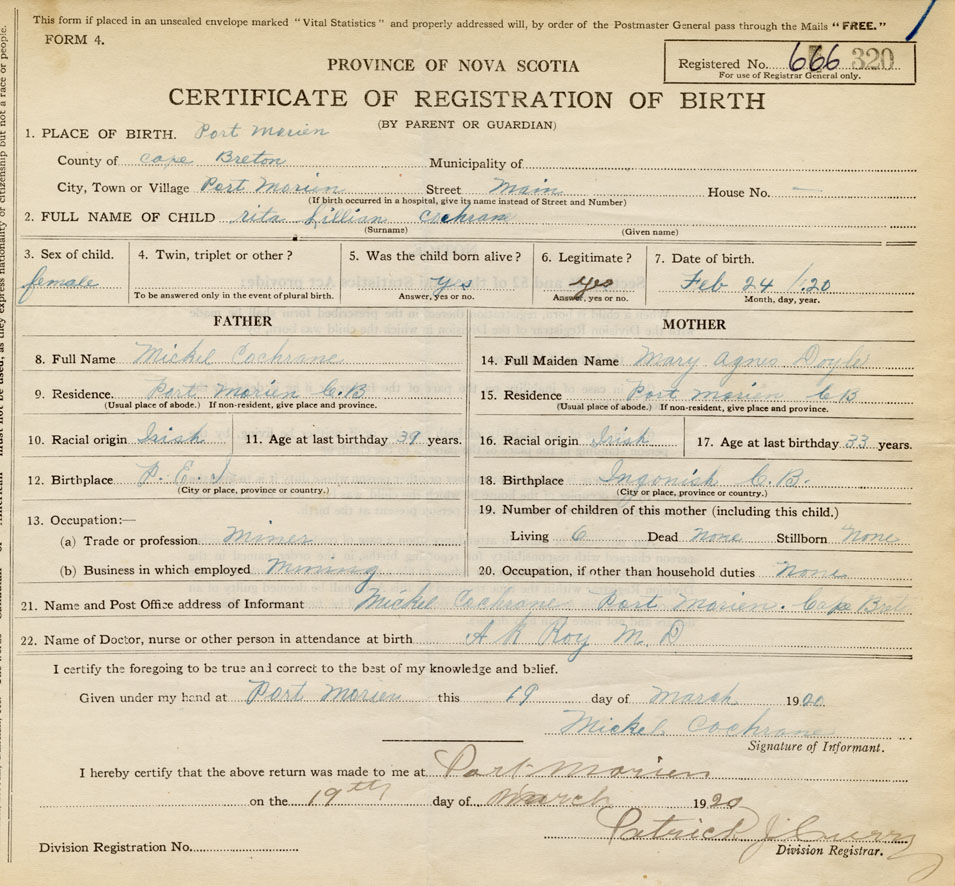 21. Name and Post Office address of Informant Mickel Cochrane Port Morien, Cape Breton