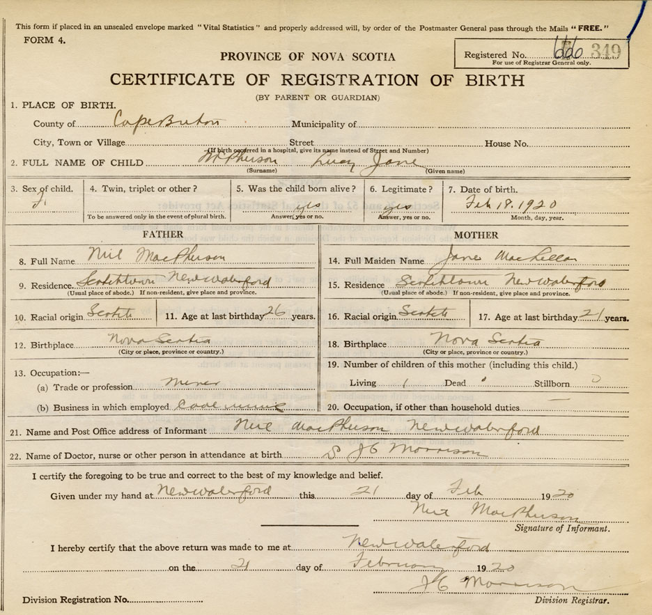21. Name and Post Office address of Informant Neil MacPherson New Waterford